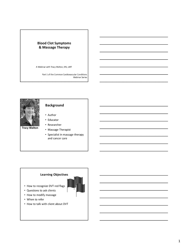 Blood Clot Symptoms & Massage Therapy Webinar with Tracy Walton, MS, LET Part 1 of the Common Cardiovascular Conditions Webinar SeriesBackground Author Educator Researcher Tracy Walton Massage Therapist