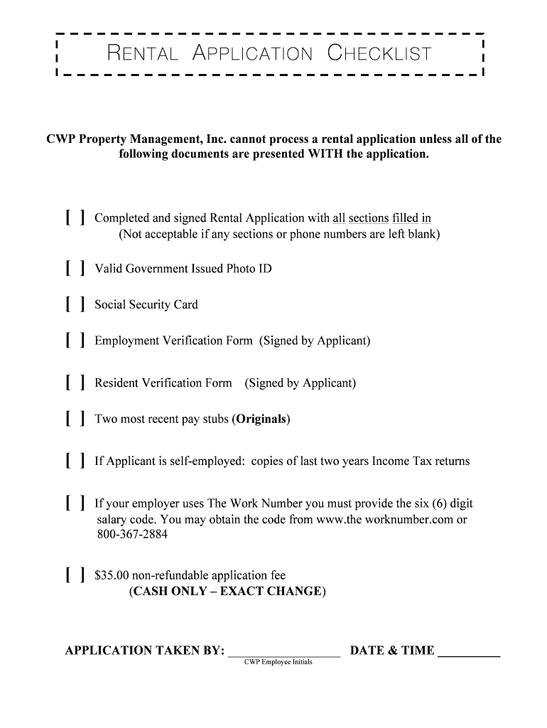 RENTAL APPLICATION CHECKLIST CWP Property Management, Inc. cannot process a rental application unless all the following documents are presented WITH the application. Completed and signed Rental Application