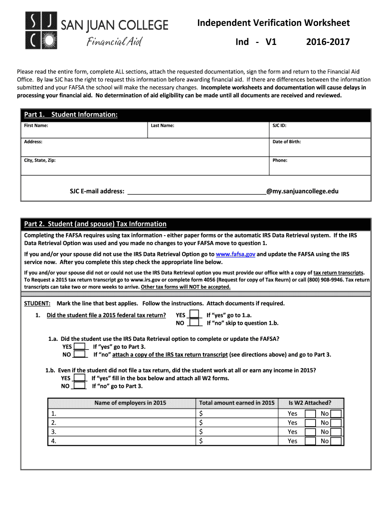 Get the free Ind Verif Worksheet 15-16 - V1 - sanjuancollege
