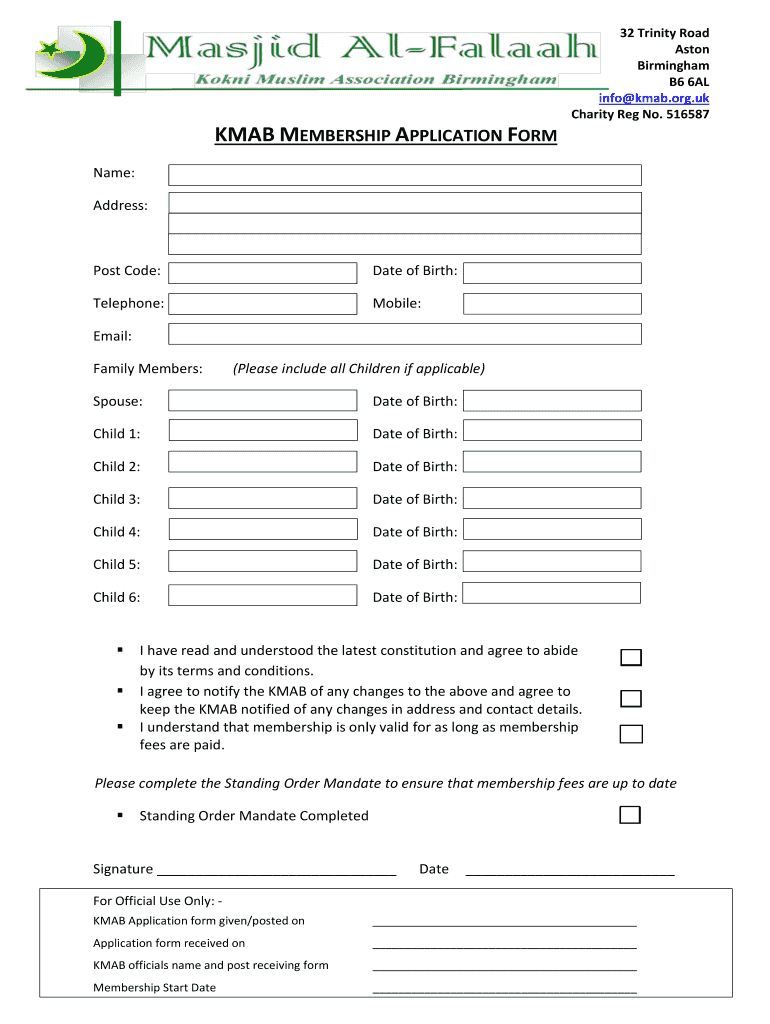 32 Trinity Road Aston Birmingham B6 6AL info GMAB.org.UK Charity Reg No. 516587 GMAB MEMBERSHIP APPLICATION FORM Name: Address: Post Code: Date of Birth: