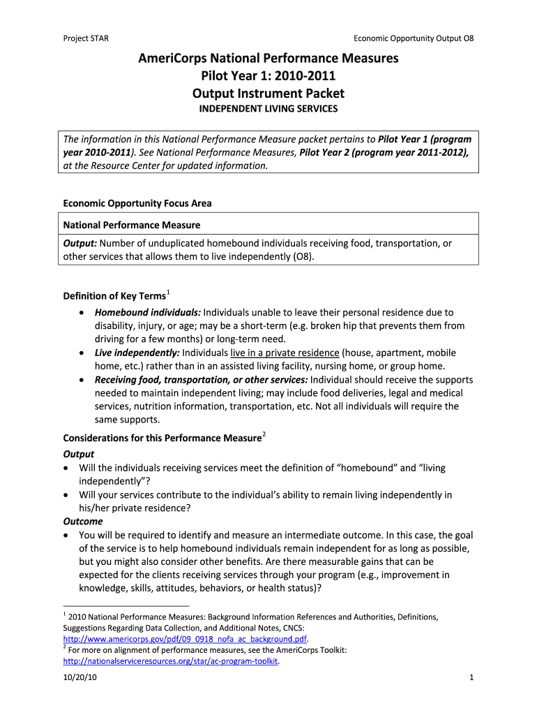 Project STAR Economic Opportunity Output O8 AmeriCorps National Performance Measures Pilot Year 1: 20102011 Output Instrument Packet INDEPENDENT LIVING SERVICES The information in this National Performance