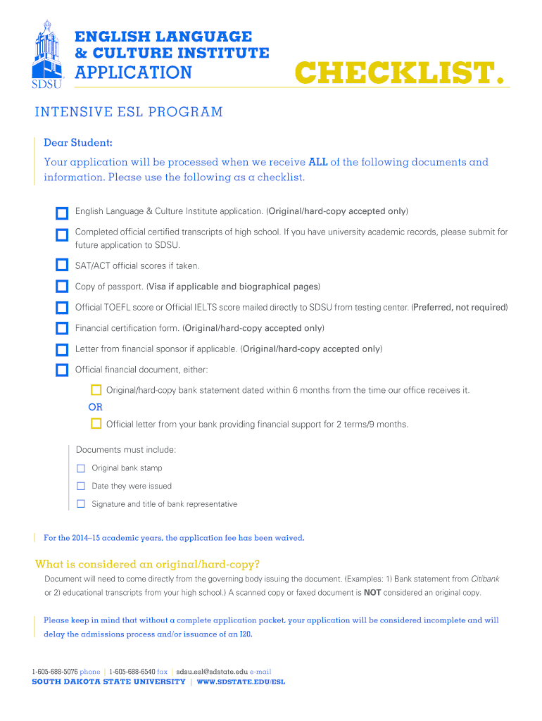 ENGLISH LANGUAGE & CULTURE INSTITUTE APPLICATION CHECKLIST. INTENSIVE ESL PROGRAM Dear Student: Your application will be processed when we receive All the following documents and information. Please