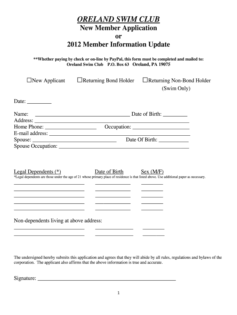 Get the free ORELAND SWIM CLUB New Member Application or 2012 Member Information Update **Whether...