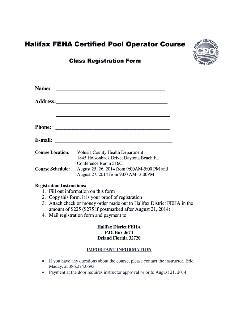 Halifax FHA Certified Pool Operator Course Class Registration Form Name: Address: Phone: Email: Course Location: Course Schedule: Volusia County Health Department 1845 Horseback Drive, Daytona Beach