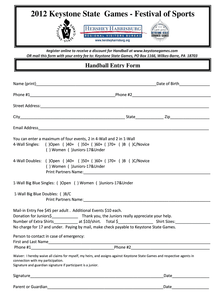 Get the free 2012 Keystone State Games Festival of Sports HANDBALL MAIL IN ENTRY FORM Register on...