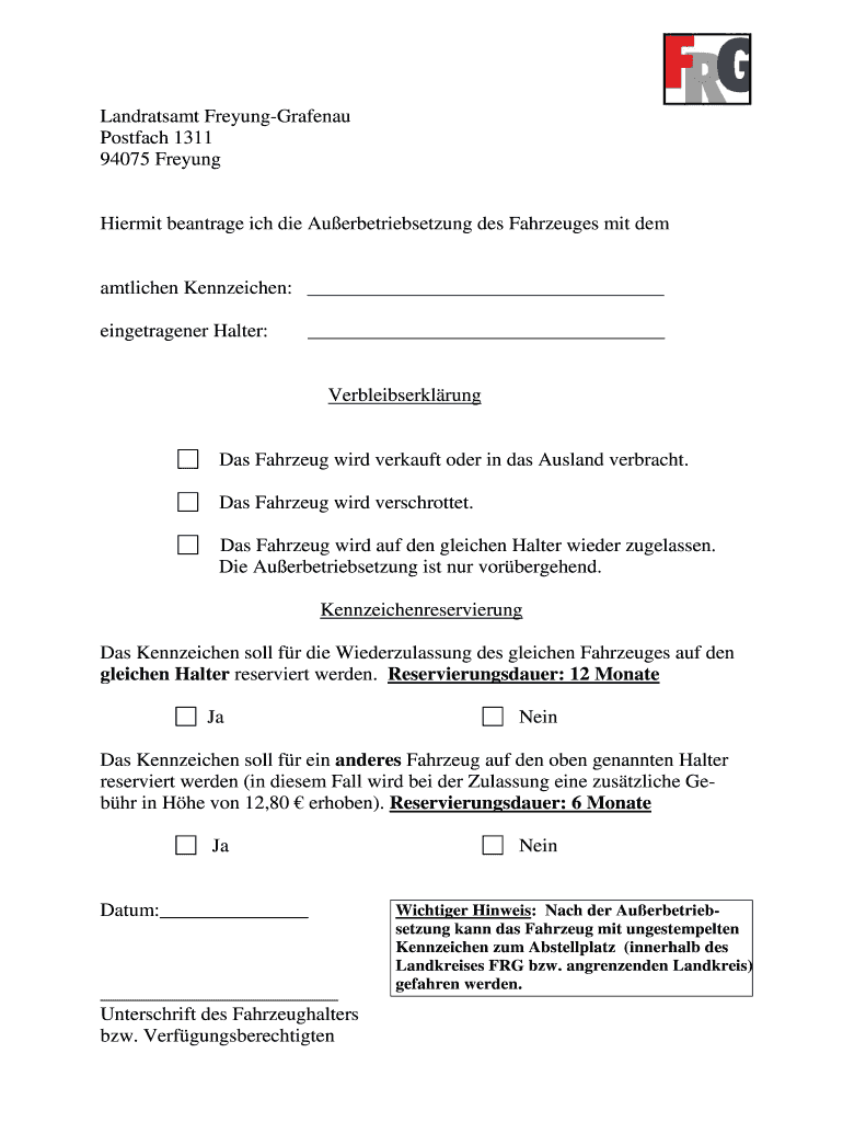 Landratsamt Freyung-Grafenau. Postal 1311. 94075 Frank. Hermit barrage ICH die Au erbetriebsetzung DES Fahrzeuges MIT them. Amt lichen Kennzeichen: