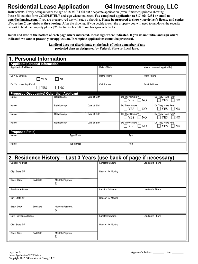 Residential Lease Application. G4 Investment Group, LLC. Instructions: Every occupant over the age of 18 MUST fill out a separate application (even if married) ...