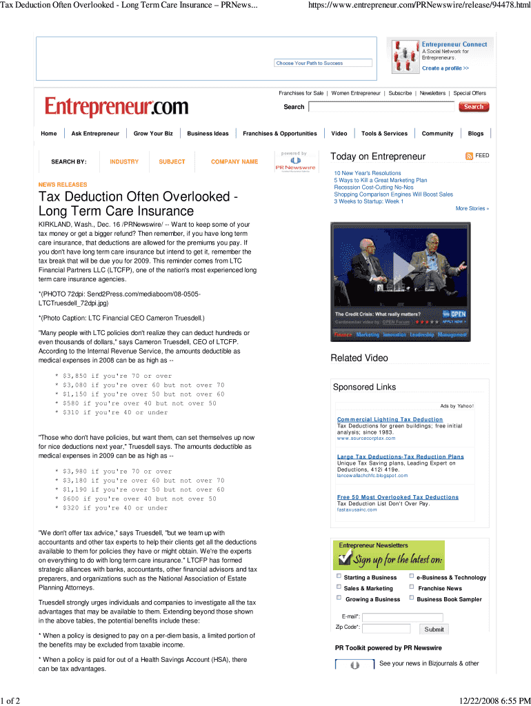 Tax Deduction Often Overlooked Long Term Care Insurance News... 1 of 2 https://www.entrepreneur.com/PRNewswire/release/94478.html Franchises for Sale Women Entrepreneur Subscribe Newsletters Special