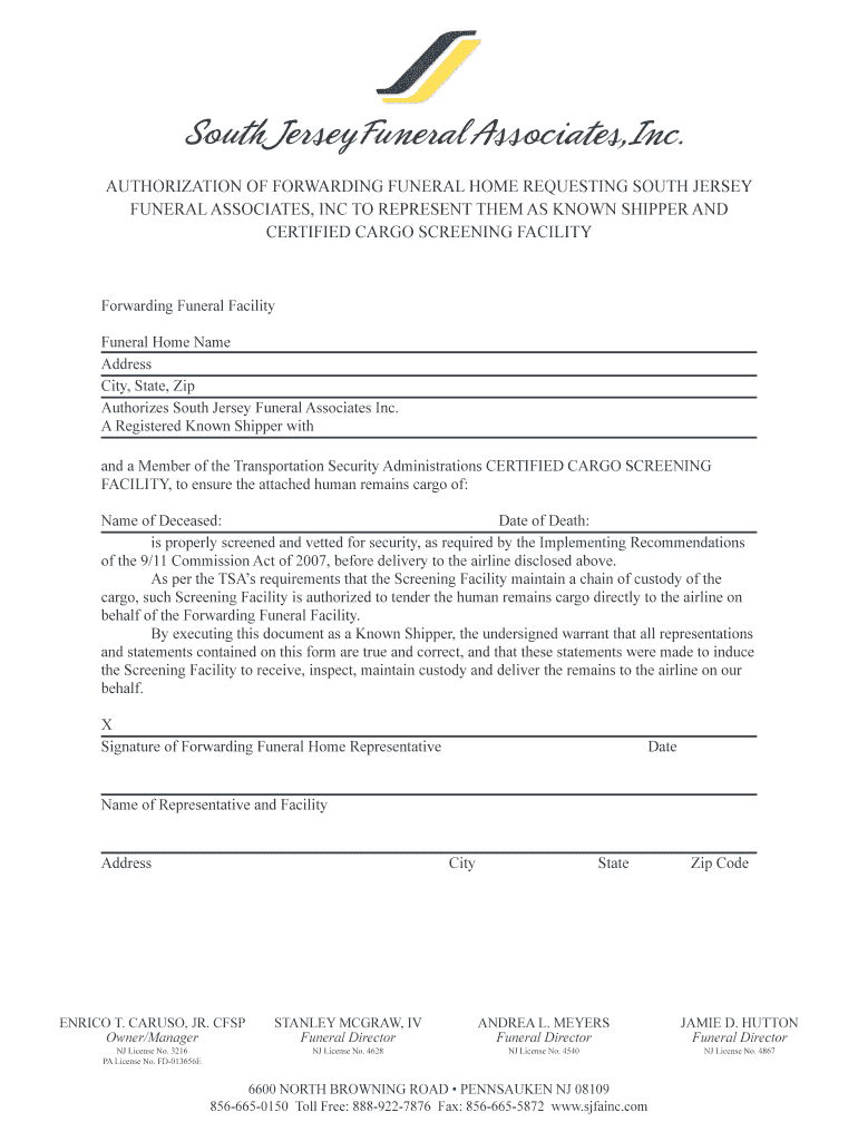AUTHORIZATION OF FORWARDING FUNERAL HOME REQUESTING SOUTH JERSEY FUNERAL ASSOCIATES, INC TO REPRESENT THEM AS KNOWN SHIPPER AND CERTIFIED CARGO SCREENING FACILITY Forwarding Funeral Facility Funeral