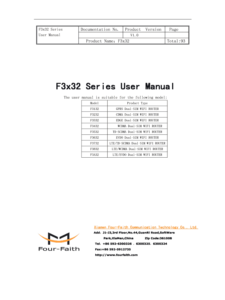F3x32 Series User Manual Documentation No. Product Version Page V1.0 Product NameF3x32 Total:93 F3x32 Series User Manual The user manual is suitable for the following model: Model Product Type F3132