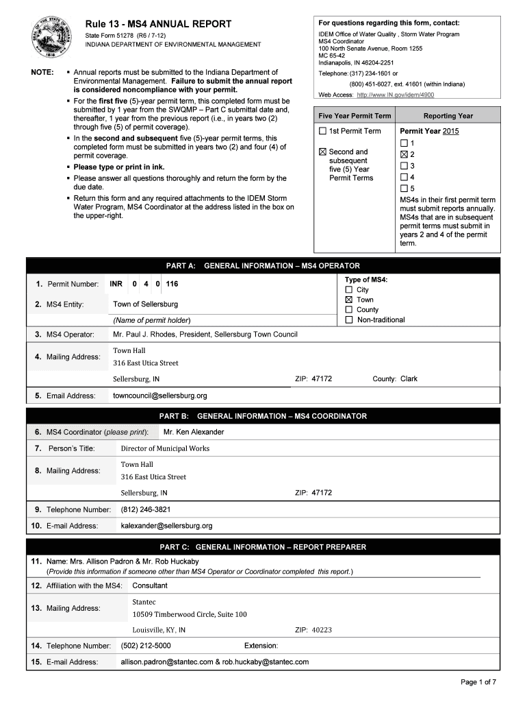 Rule 13 MS4 ANNUAL REPORT For questions regarding this form, contact: IDEM Office of Water Quality, Storm Water Program MS4 Coordinator 100 North Senate Avenue, Room 1255 MC 6542 Indianapolis, IN
