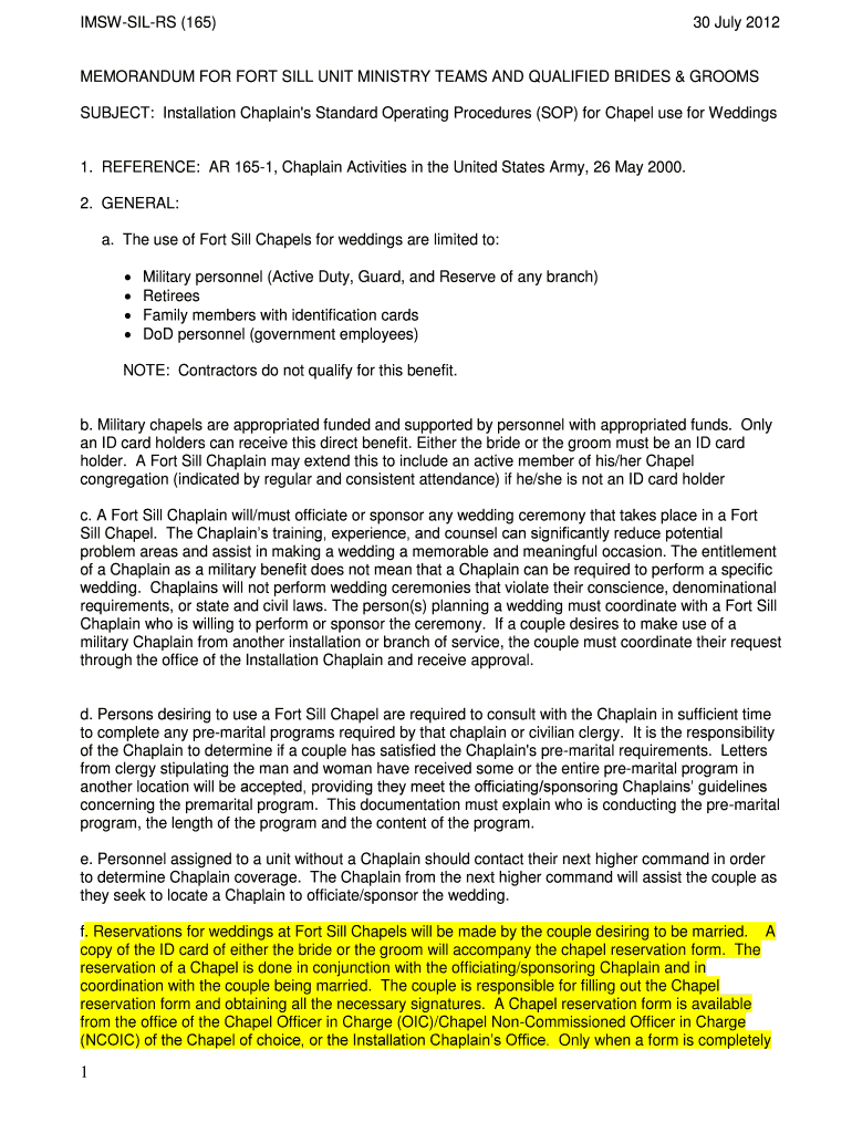 IMSWSILRS (165) 30 July 2012 MEMORANDUM FOR FORT SILL UNIT MINISTRY TEAMS AND QUALIFIED BRIDES & GROOMS SUBJECT: Installation Chaplain's Standard Operating Procedures (SOP) for Chapel use for Weddings