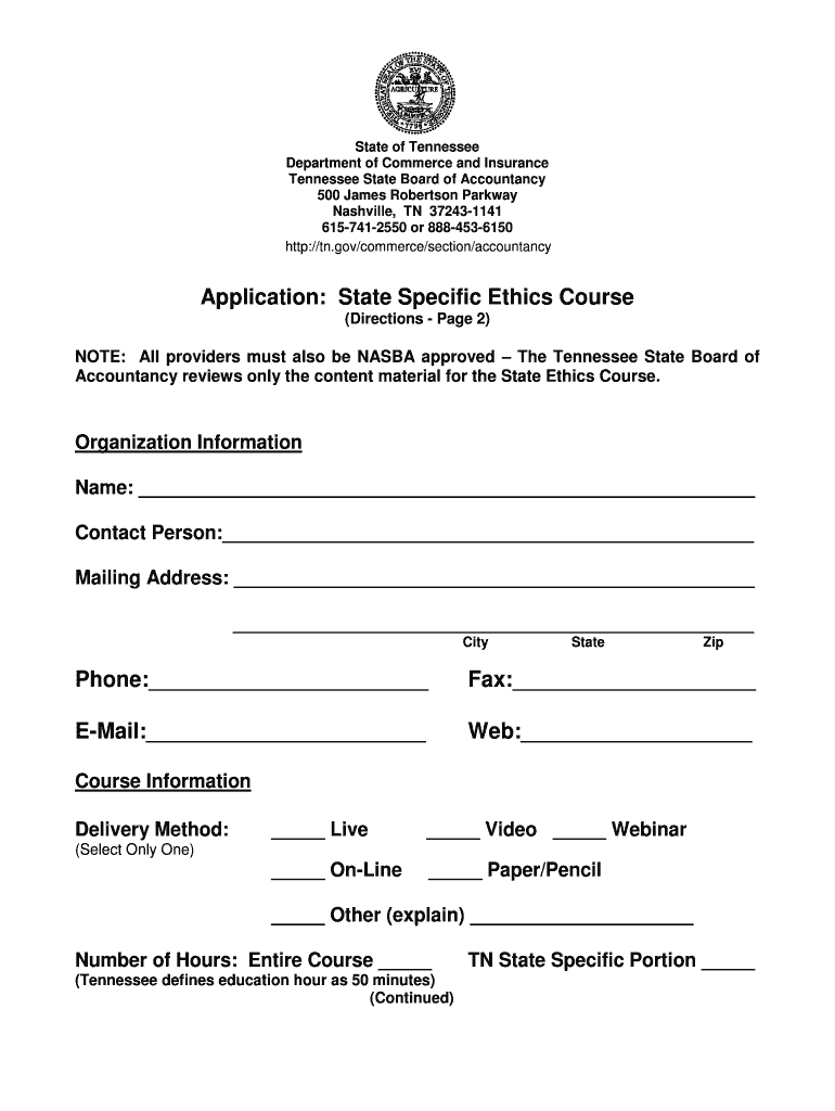 Get the free Application: State Specific Ethics Course - State of Tennessee - tn