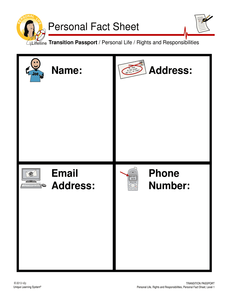 E PEO NAL L IF RS Personal Fact Sheet Transition Passport / Personal Life / Rights and Responsibilities Name: Email Address: 2013 n2y Unique Learning System Address: Phone Number: TRANSITION PASSPORT