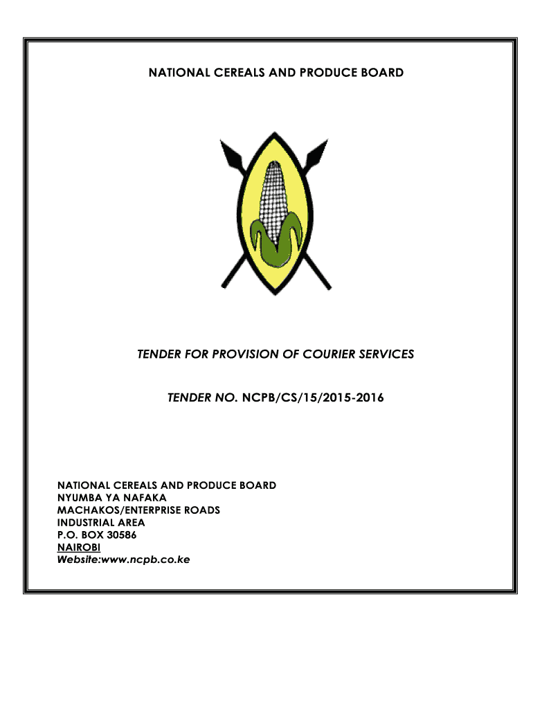 NATIONAL CEREALS AND PRODUCE BOARD TENDER FOR PROVISION OF COURIER SERVICES TENDER NO. ENCPB/CS/15/20152016 NATIONAL CEREALS AND PRODUCE BOARD NYU MBA YA NAFTA MACHADO/ENTERPRISE ROADS INDUSTRIAL