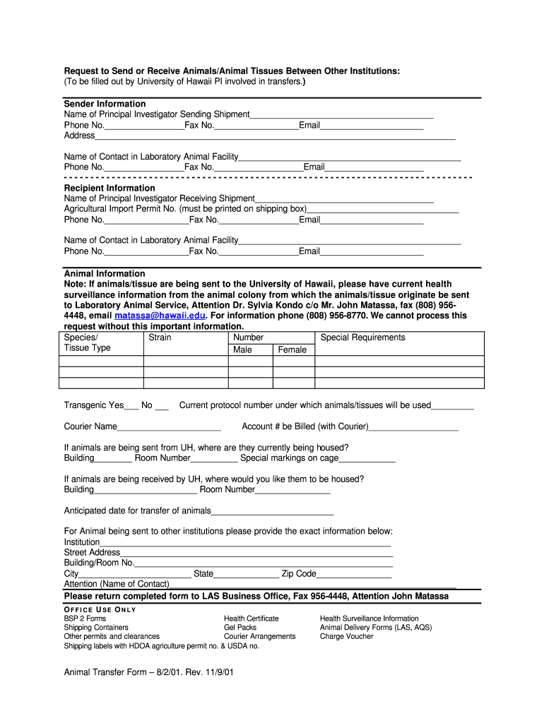 This form is to be completed by Principal Investigators at the University of Hawaii who are involved in transferring animals or animal tissues to and from other institutions. It includes sections