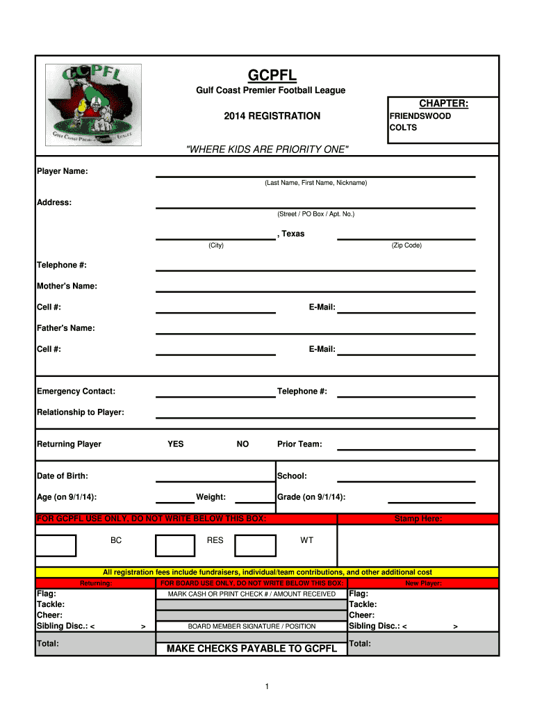 GCP FL Gulf Coast Premier Football League CHAPTER: 2014 REGISTRATION FRIENDSWOOD COLTS “WHERE KIDS ARE PRIORITY ONE” Player Name: (Last Name, First Name, Nickname) Address: (Street / PO Box /