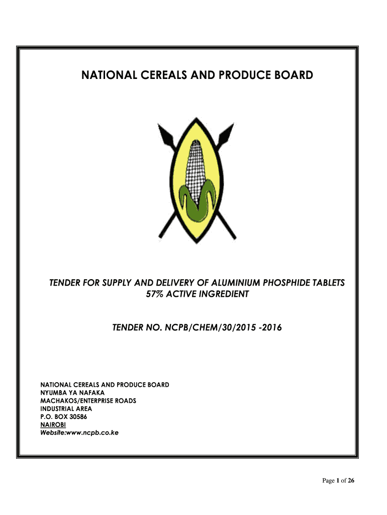 NATIONAL CEREALS AND PRODUCE BOARD TENDER FOR SUPPLY AND DELIVERY OF Aluminum PHOSPHIDE TABLETS 57% ACTIVE INGREDIENT TENDER NO. ENCPB/CHEM/30/2015 2016 NATIONAL CEREALS AND PRODUCE BOARD NYU MBA