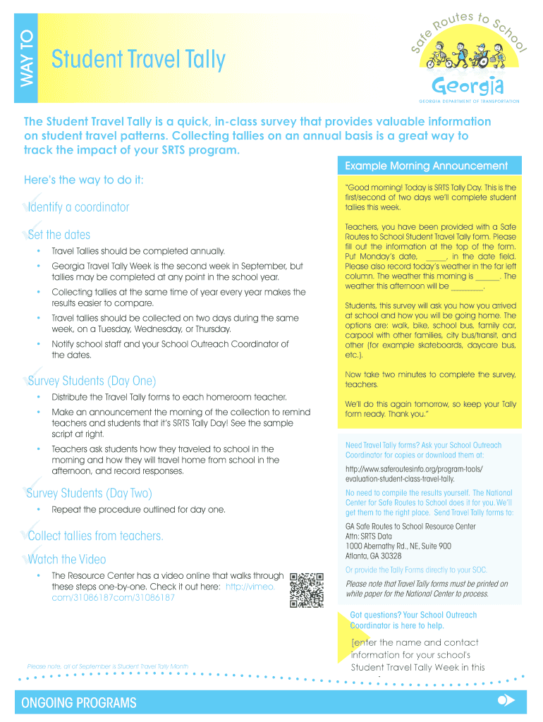Once completed, the Student Travel Tally Form can be submitted either online or via traditional methods, depending on school guidelines. Submission timelines and deadlines typically align with the annual data collection cycle, often set for September in Georgia.
