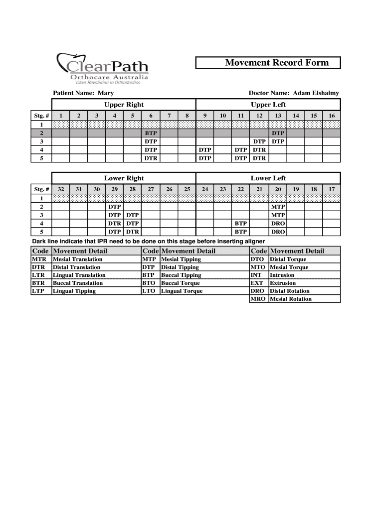 Movement Record Form Patient Name Mary Doctor Name Adam Elshaimy Upper Right Stg. Upper Left BTP DTP DTR DTP DTR Lower Right Lower Left DTR DTP MTP DRO Dark line indicate that IPR need to be done on this stage before inserting aligner Code Movement Detail MTR LTR BTR LTP BTO LTO DTO MTO INT EXT MRO Mesial Translation Distal Translation Lingual Translation Buccal Translation Lingual Tipping Mesial Tipping Distal Tipping Buccal Tipping Buccal Torque Lingual Torque Distal Torque Mesial Torque...
