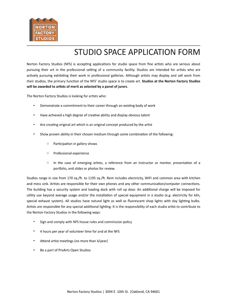 STUDIO(SPACE(APPLICATION(FORM(Norton(Factory(Studios((NFS)(is(accepting(applications(for(studio(space(from(né(artists(who(are(serious(about(pursuing(their(art(in(the(professional(Sejong(of(a(community(facility.(Studios(are(intended(for(artists(who(are(actively(pursuing(exhibiting(their(work(in(professional(galleries.(Although(artists(may(display(and(sell(work(from(their(studios,