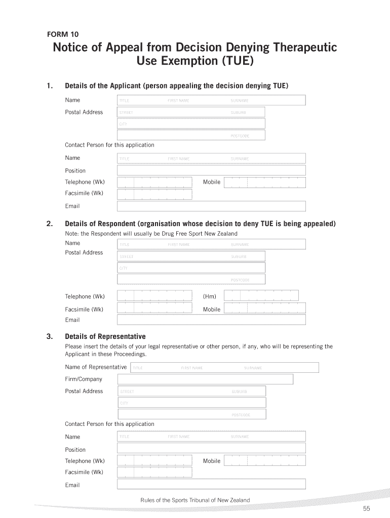 Exemption (TUE) a true copy of the Notice of Appeal from Decision Denying Therapeutic Use ... Use Exemption (TUE) (Form 11) with the Sports Tribunal.