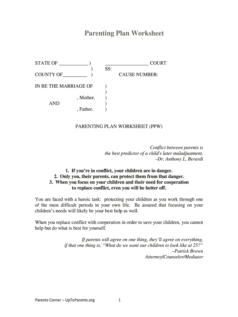 Parenting Plan Worksheet STATE OF)) COUNTY OF) IN RE THE MARRIAGE OF, Mother, AND, Father. COURT SS: CAUSE NUMBER:))))) PARENTING PLAN WORKSHEET (PPP) Conflict between parents is the best predictor