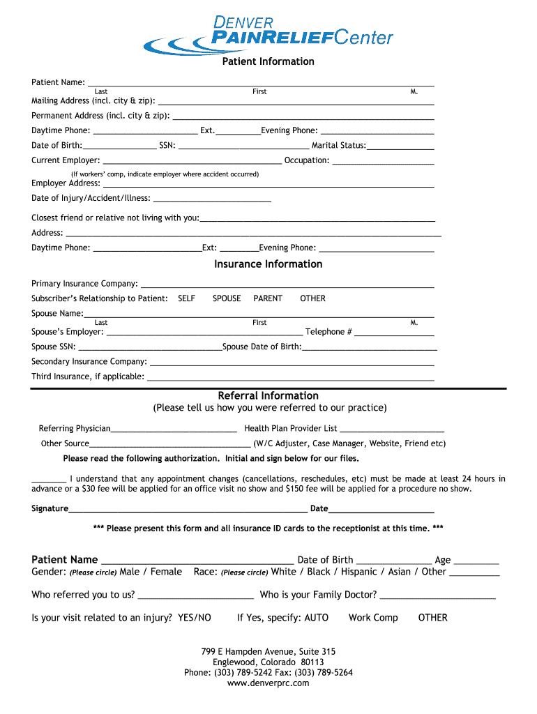 Patient Information Patient Name: Last First M. Mailing Address (incl. city & zip): Permanent Address (incl. city & zip): Evening Phone: Daytime Phone: Ext. Date of Birth: SSN: Marital Status: Current