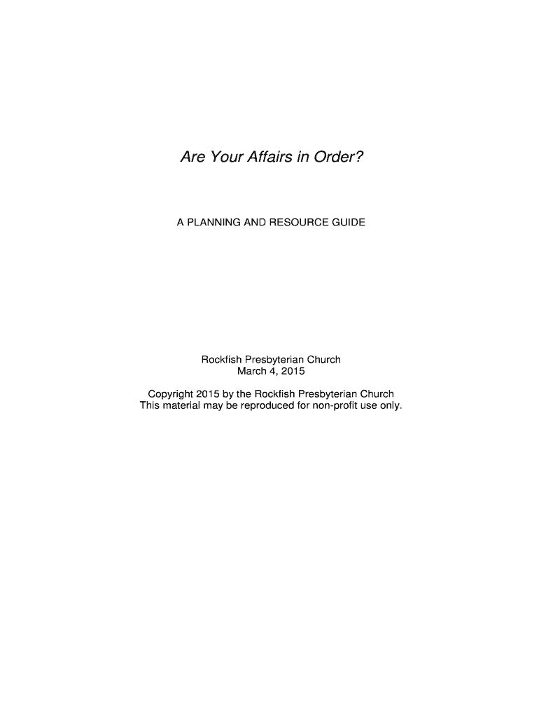 Are Your Affairs in Order? A PLANNING AND RESOURCE GUIDE Rock fish Presbyterian Church March 4, 2015, Copyright 2015 by the Rock fish Presbyterian Church This material may be reproduced for nonprofit
