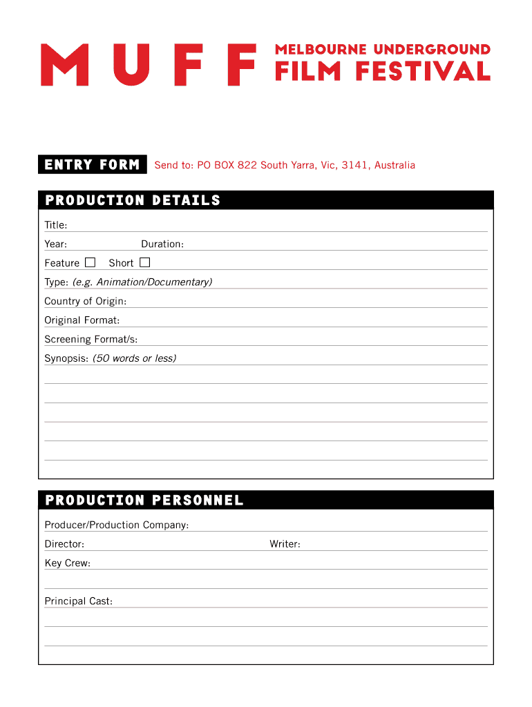 THE 11TH MELBOURNE UNDERGROUND FILM FESTIVAL ENTRY FORM Send to: PO BOX 822 South Area, Vic, 3141, Australia PRODUCTION DETAILS Title: Year: Feature Duration: Short Type: (e.g. Animation/Documentary)