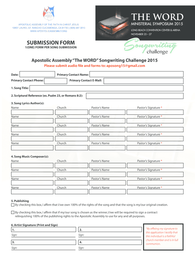 Submission Form 1(one) Form PER Song Submission Apostolic Assembly The Word Songwriting Challenge 2015 Please submit audio file and forms to: aposong15 gmail.com
