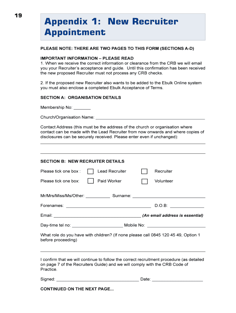This document is used for appointing a new recruiter within an organization, detailing the necessary steps and information required to ensure compliance with CRB requirements.