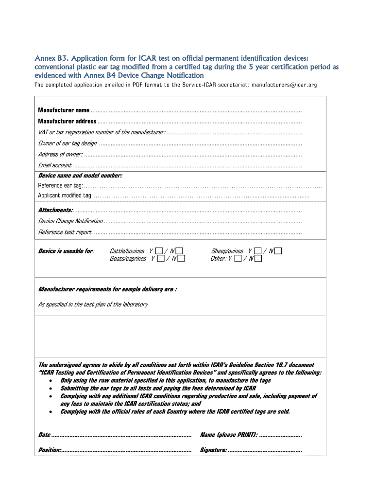 Application form for CAR test on official permanent identification devices: conventional plastic ear tag modified from a certified tag during the 5-year certification ...