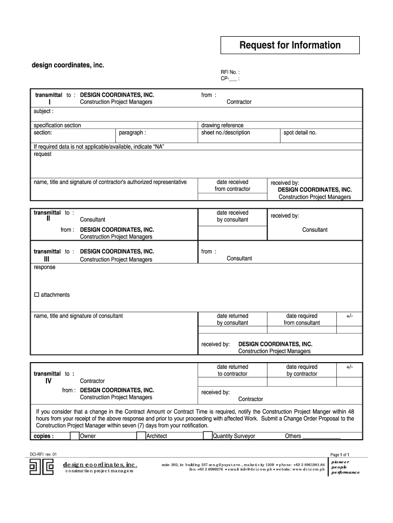 Request for Information transmittal to : DESIGN COORDINATES, INC. Construction Project Managers from : Contractor subject : ...