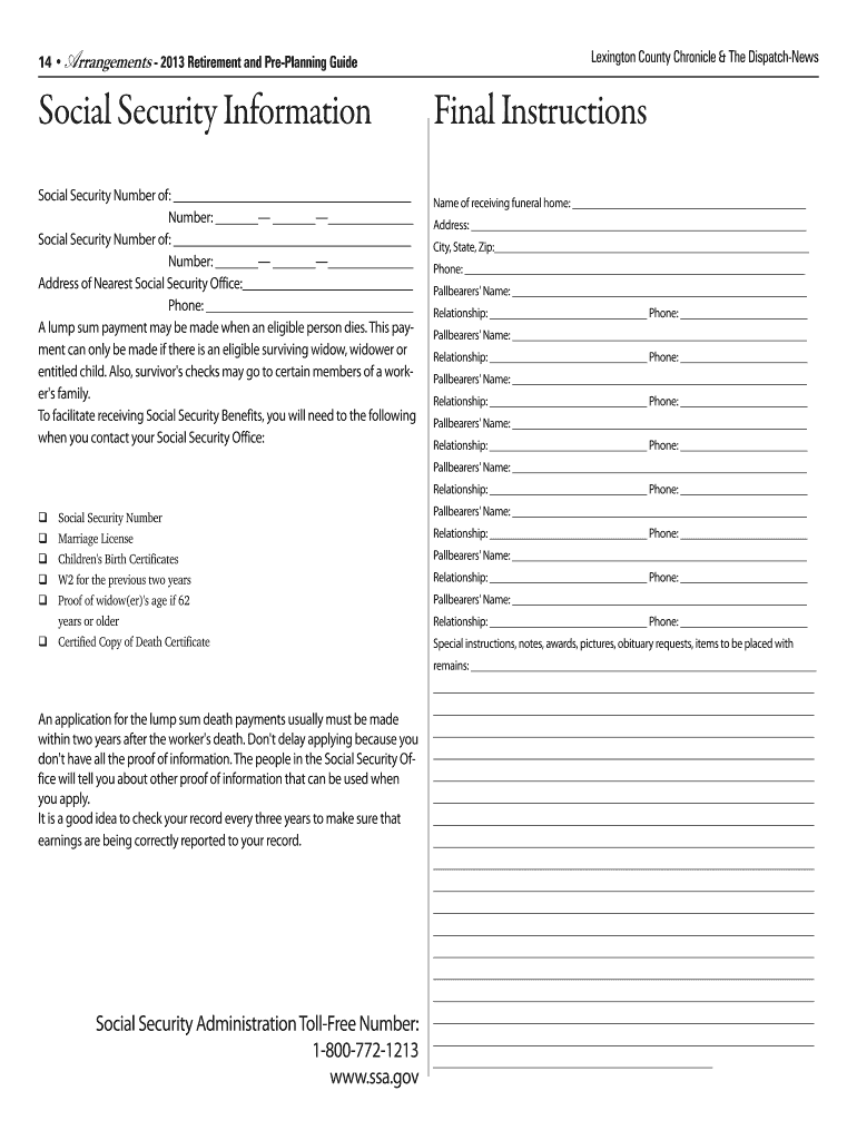 Key components of this guide include personal information fields, as well as instructional areas that detail what information is needed and how to reach the Social Security Office. Overall, the guide ensures a comprehensive approach to planning for such an important event.