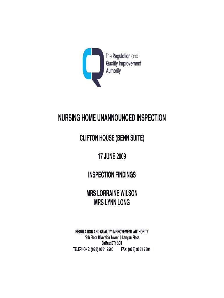 NURSING HOME UNANNOUNCED INSPECTION CLIFTON HOUSE (BEEN SUITE) 17 JUNE 2009 INSPECTION FINDINGS MRS LORRAINE WILSON MRS LYNN LONG REGULATION AND QUALITY IMPROVEMENT AUTHORITY 9th Floor Riverside Tower,
