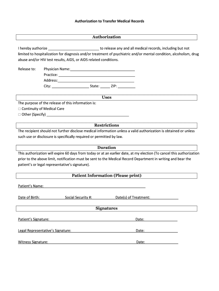 Authorization to Transfer Medical Records Authorization I hereby authorize to release any and all medical records, including but not limited to hospitalization for diagnosis and/or treatment of psychiatric