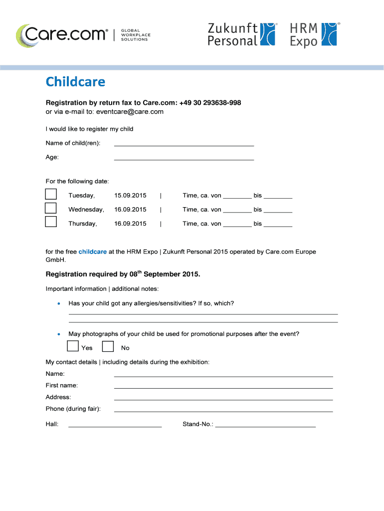 Childcare. Registration by return fax to Care.com: +49 30 293638-998. Or via e-mail to: event care×care.com. I would like to register my child. Name of child(men.