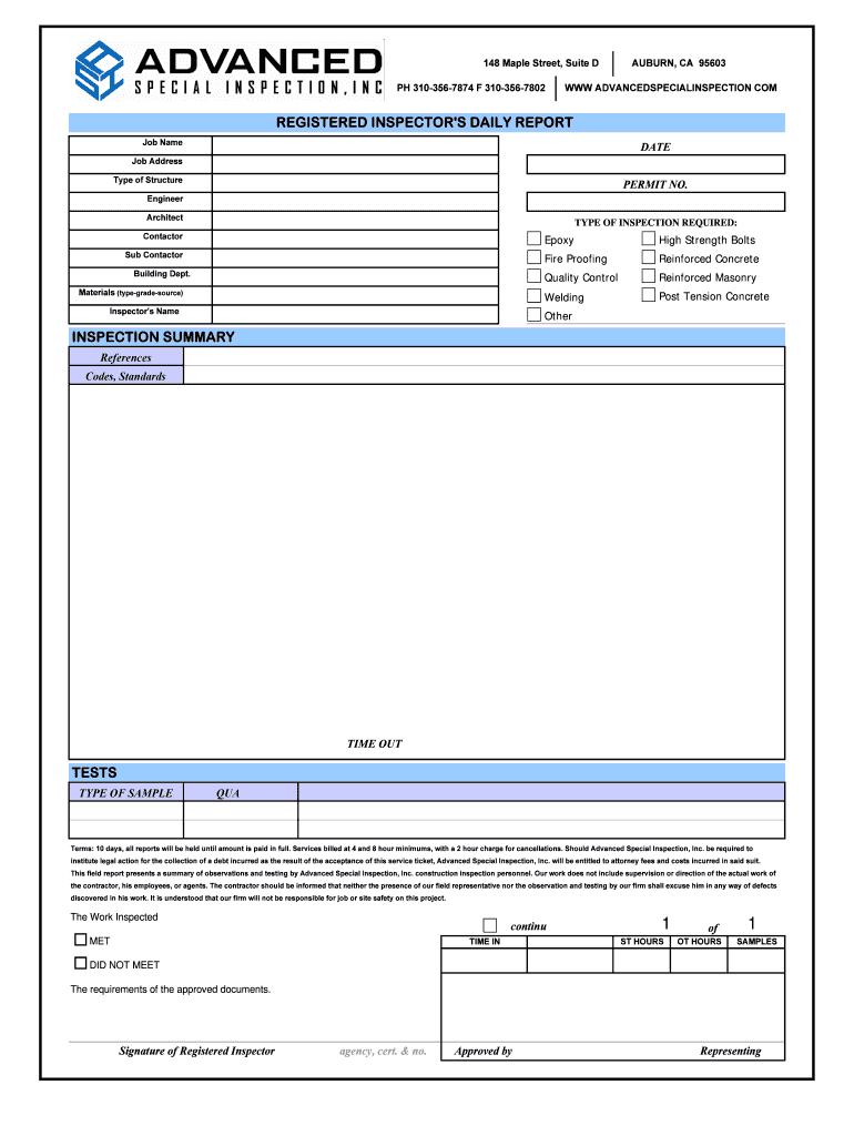 REGISTERED INSPECTOR#039’S DAILY REPORT. Reinforced Masonry High Strength Bolts Reinforced Concrete Post Tension Concrete Epoxy Fire Proofing Quality Control Welding Other.