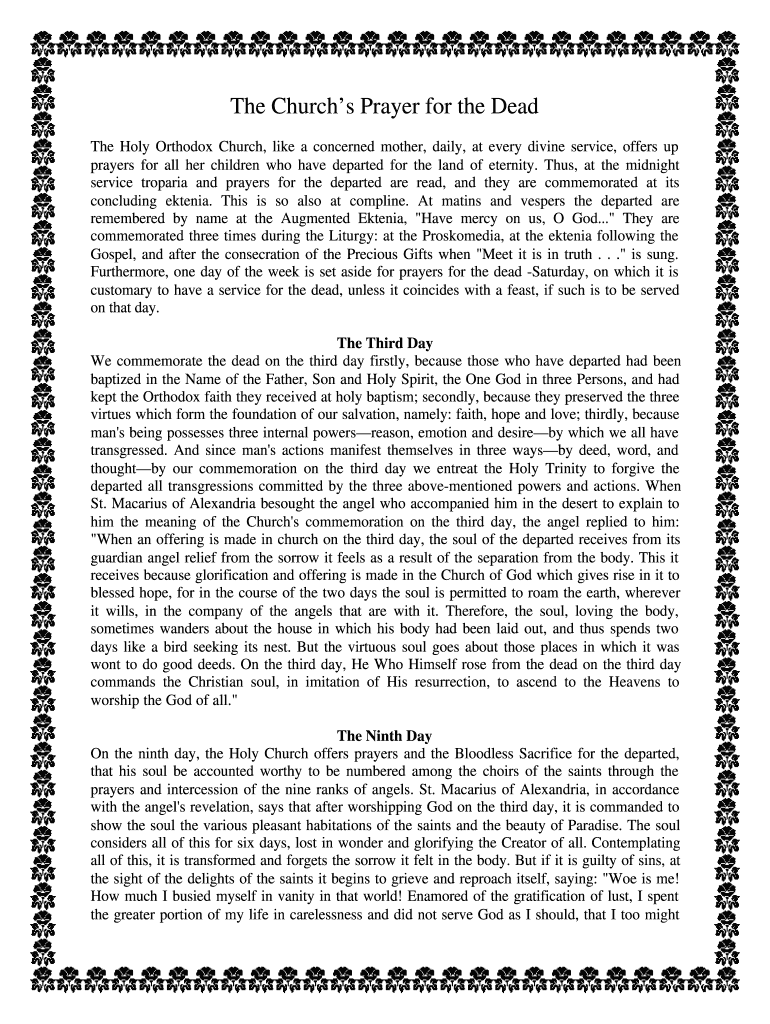 The Church's Prayer for the Dead The Holy Orthodox Church, like a concerned mother, daily, at every divine service, offers up prayers for all her children who have departed for the land of eternity.