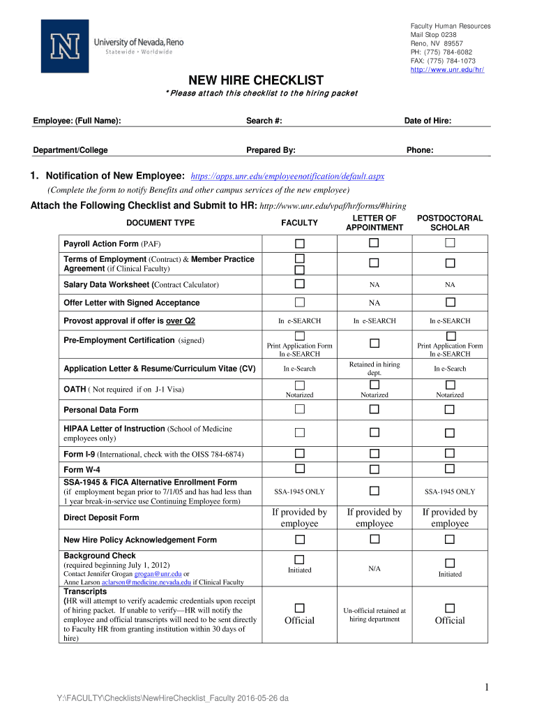 The new hire checklist can be filled out by the employer or HR department by entering the required information for each new employee.
