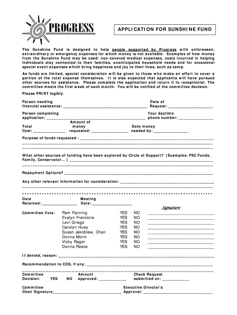 APPLICATION FOR SUNSHINE FUND The Sunshine Fund is designed to help people supported by Progress with unforeseen, extraordinary or emergency expenses for which money is not available. Examples of