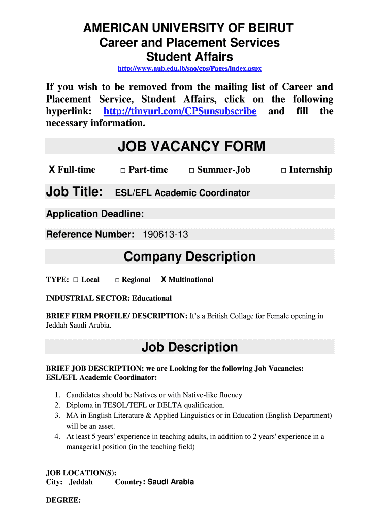 Get the free Job Vacancy Form - aub edu