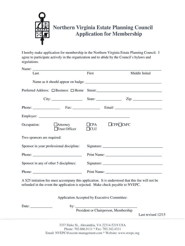 Northern Virginia Estate Planning Council Application for Membership. I hereby make application for membership in the Northern Virginia Estate Planning Council.