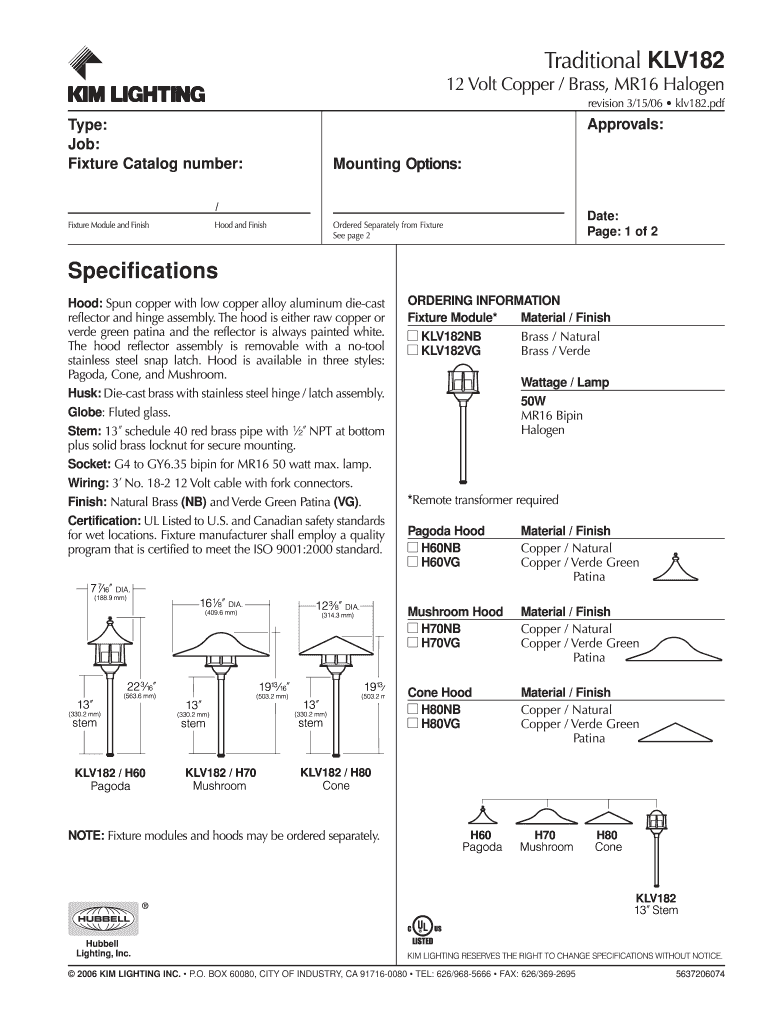 Reset Form Traditional KLV182 12 Volt Copper / Brass, MR16 Halogen revision 3/15/06 klv182.pdf Approvals: Type: Job: Fixture Catalog number: Mounting Options: / Fixture Module and Finish Hood and