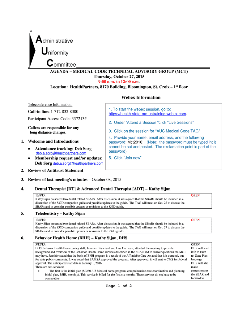 W AGENDA MEDICAL CODE TECHNICAL ADVISORY GROUP (MCT) Thursday, October 27, 2015 9:00 a.m. to 12:00 a.m. Location: HealthPartners, 8170 Building, Bloomington, St. Croix 1st floor Webex Information