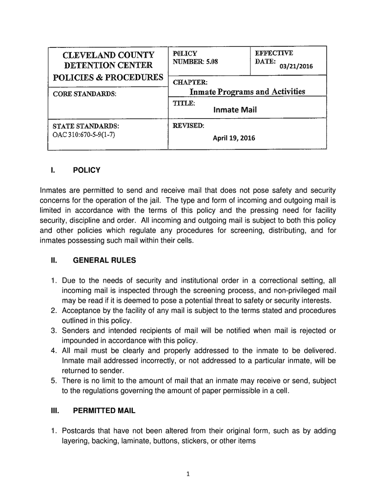 April 19, 2016I.POLICYInmates are permitted to send and receive mail that does not pose safety and security
