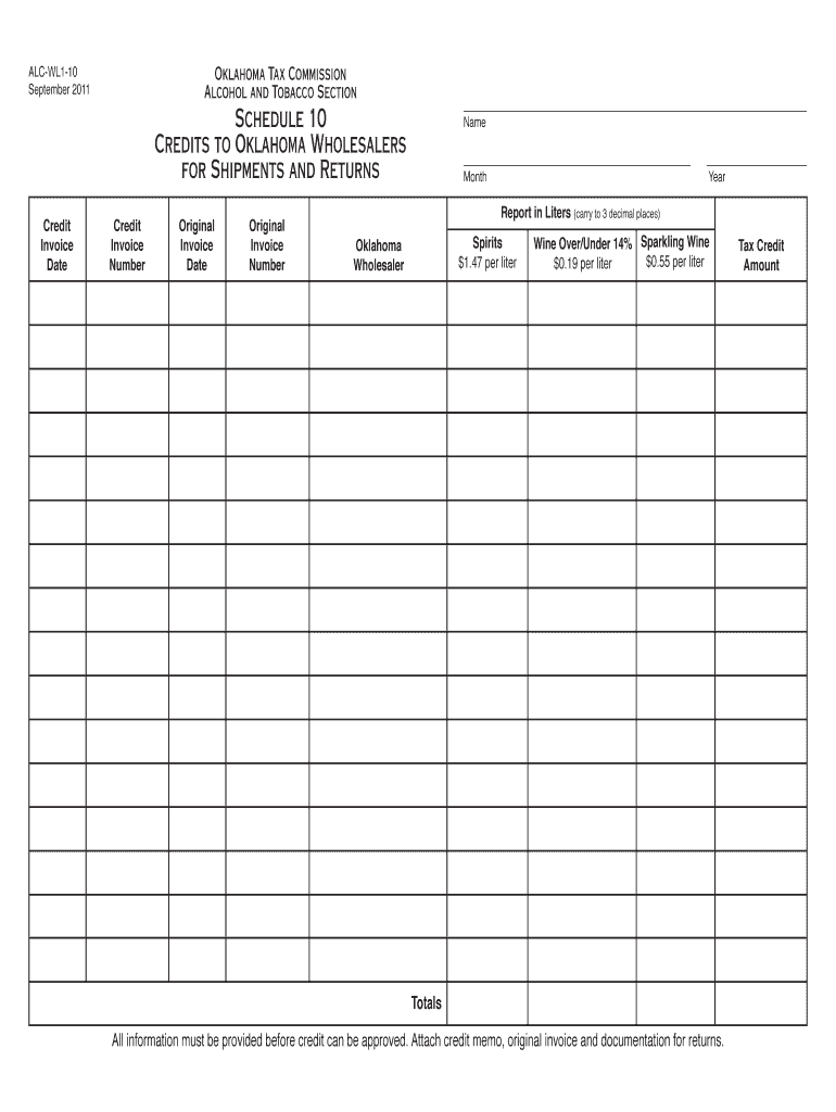 Credit. Invoice. Number. Oklahoma. Wholesaler. Oklahoma Tax Commission. Alcohol and Tobacco Section. Schedule 10. Credits to Oklahoma Wholesalers.