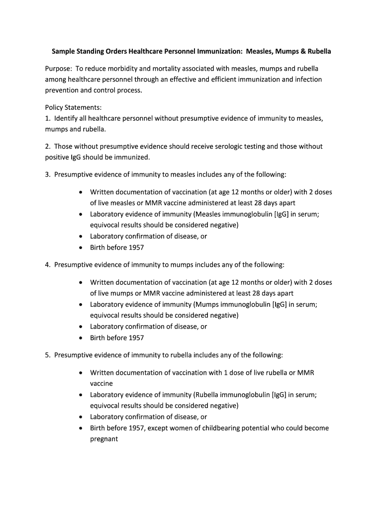 Get the free Sample Standing Orders Healthcare Personnel Immunization: Measles, Mumps &