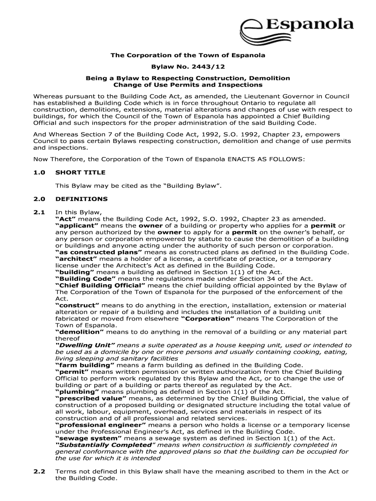 Being a Bylaw to Respecting Construction, Demolition, Change of Use Permits and Inspections for The Corporation of the Town of Espanola.